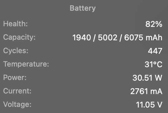 Here are the battery stats. It’s not in perfect shape - the laptop is nearly four years old, the capacity is at 82%, which is roughly 55 watt‑hours of usable battery. Even so, the results were pretty illustrative: