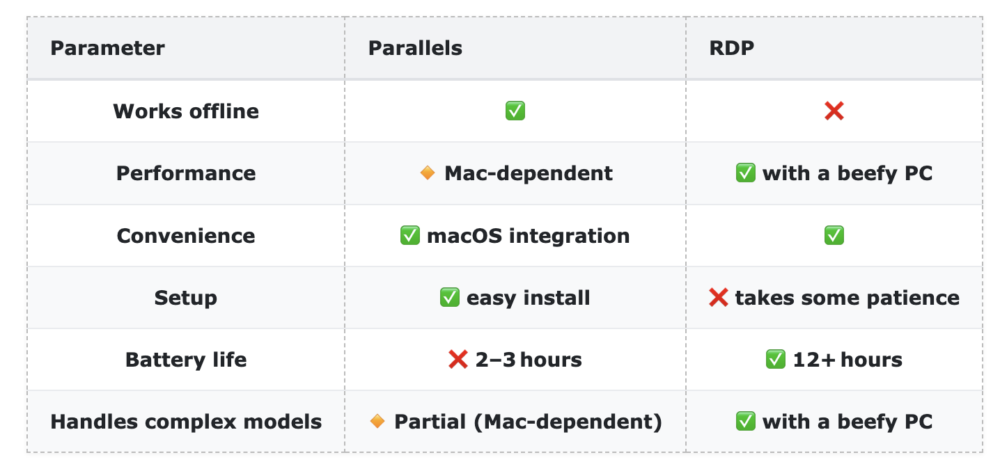 Parallels is great for working offline, RDP is better for heavy tasks. And the hybrid setup is just the go‑to standard if you want the best of both mobility and performance.